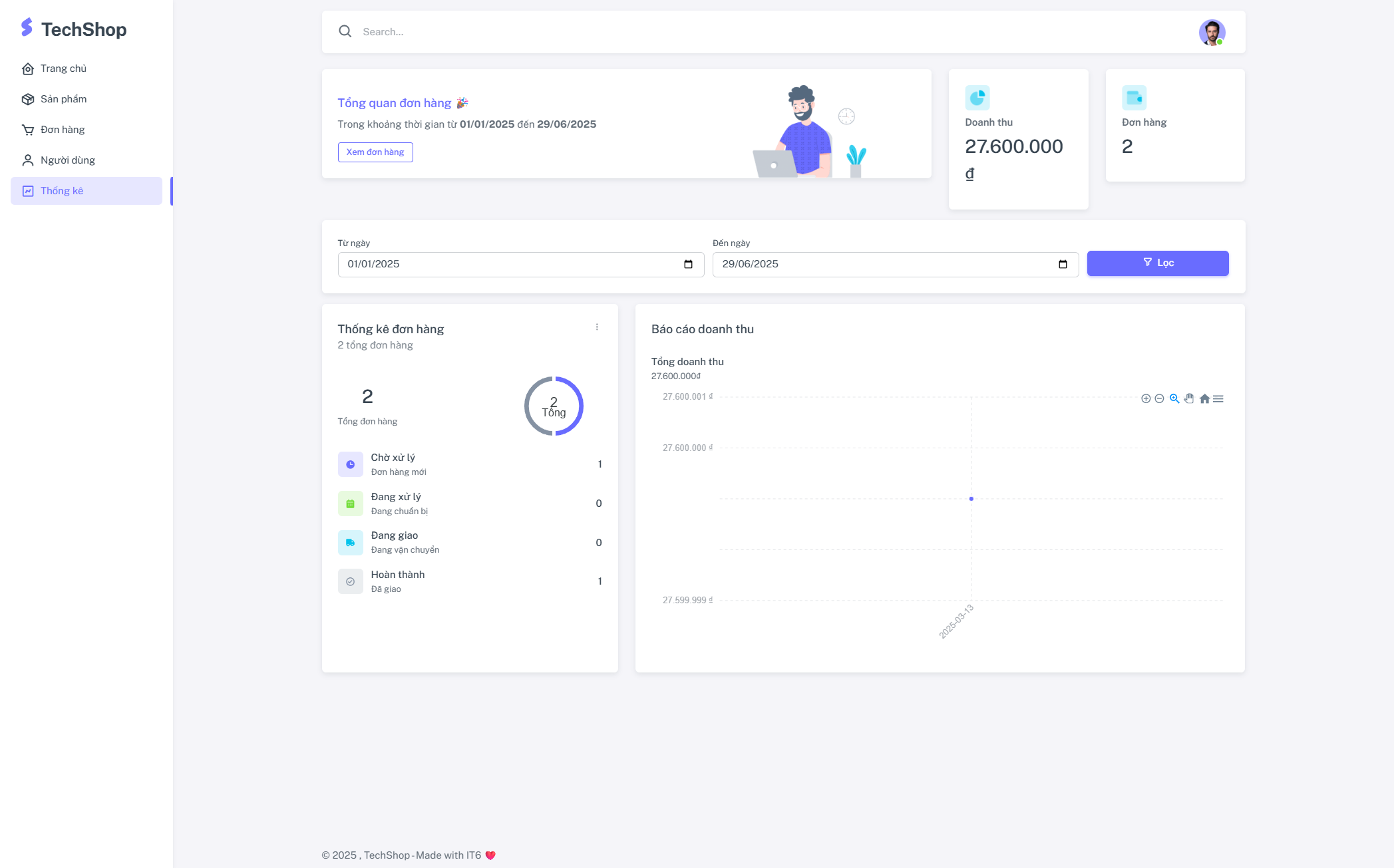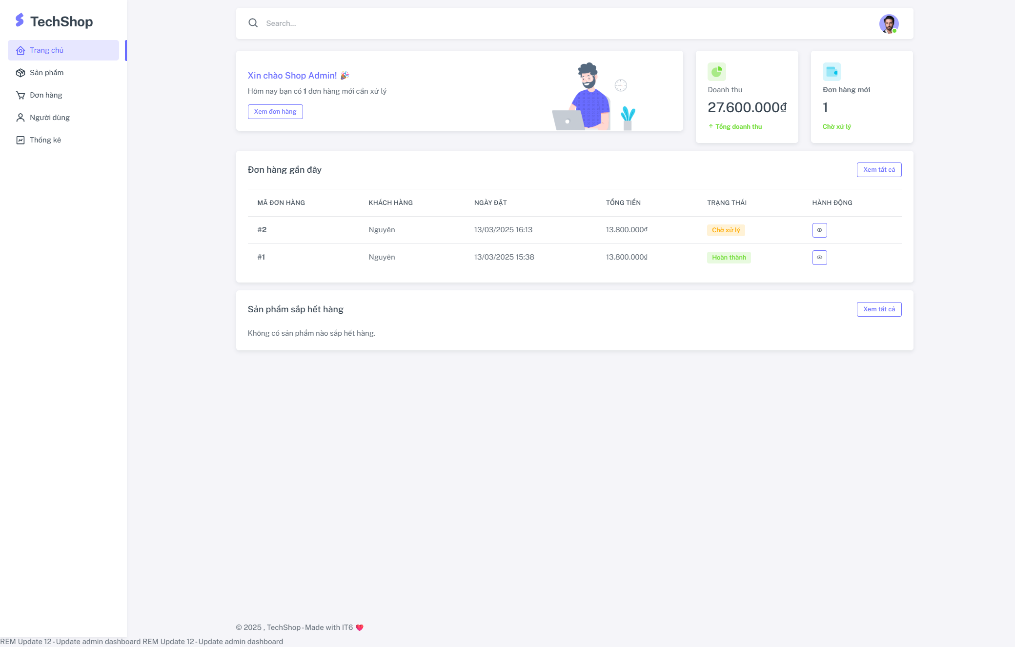 - Dashboard tổng quan - Thống kê doanh thu, đơn hàng, sản phẩm