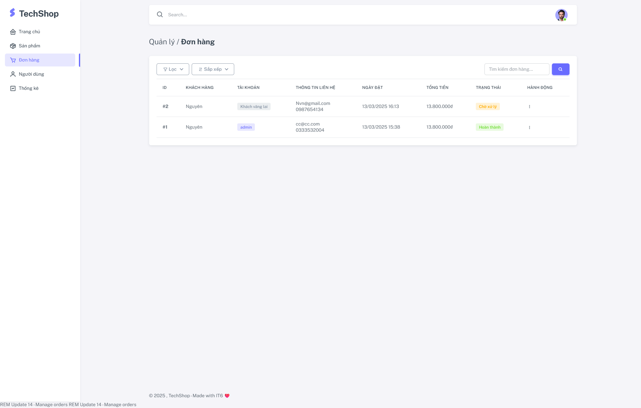 - Quản lý đơn hàng - Cập nhật trạng thái, in đơn hàng, tìm kiếm