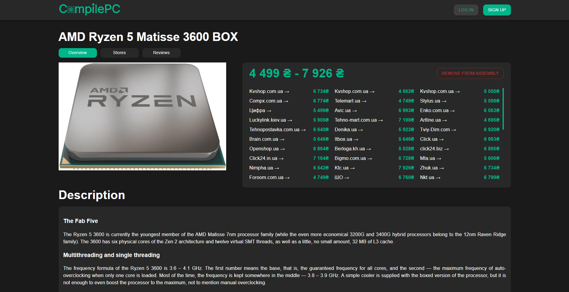 CompilePC is a web-application that enables users to easily create, save, and share custom PC assemblies using real parts with specifications and prices from various Ukrainian stores. Users can easily browse and select parts from a variety of categories, including processors, motherboards, graphics cards, memory, storage, power supplies, and more. The application provides the ability to create and save assemblies, and to share those assemblies with other users.