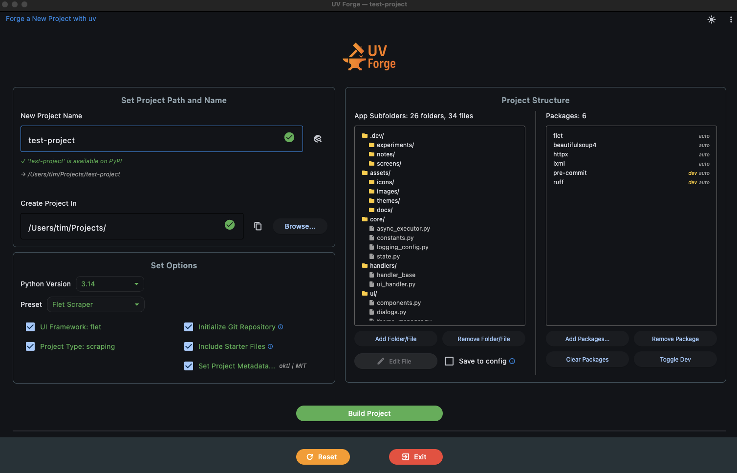 Pick a UI framework or project type, (or both), configure your options, and UV Forge generates a fully wired project: folder structure, boilerplate files, package installation, virtual environment, git repo, and pyproject.toml, and optionally does an initial commit — all in one click.