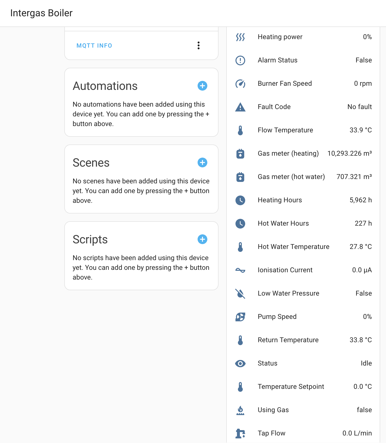 - The most relevant data is published to an MQTT broker as sensors bundled in a boiler device that is auto-discovered by Home Assistant.