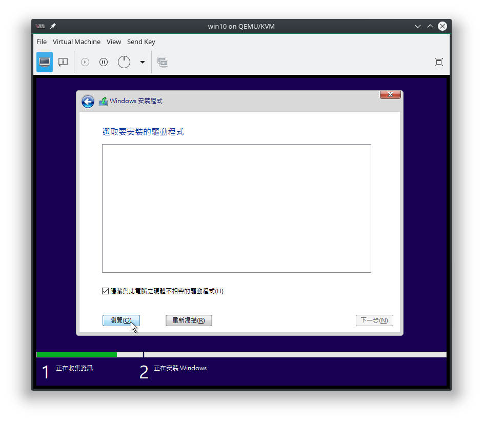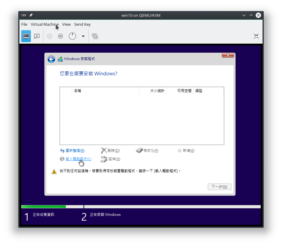 進入 Windows 安裝程式開始安裝,如果你像我一樣在硬碟 bus 的地方選用 virtio,你會看到: