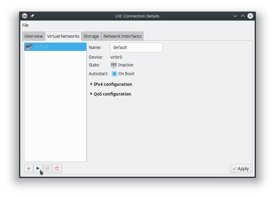 Edit -> Connection Details -> Virtual Networks, default, 句選 Autostart 然後按下播放圖示啟動 virtual network: