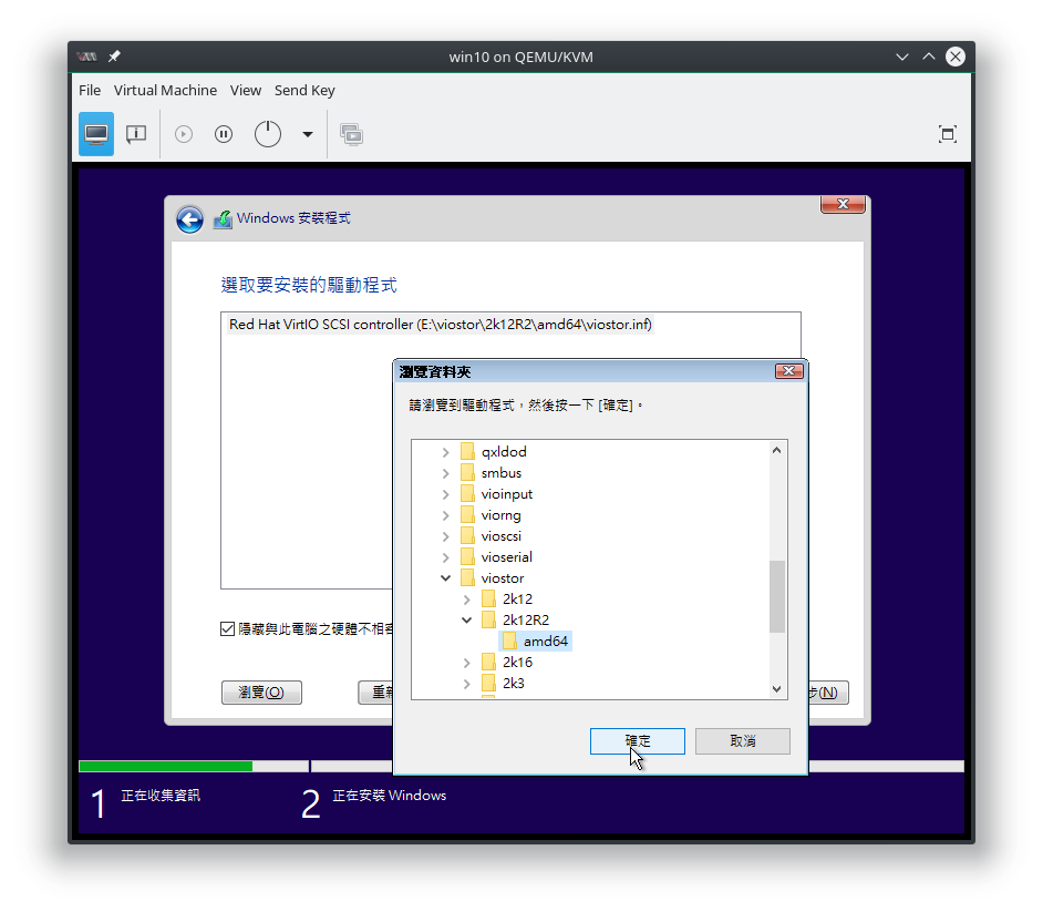 載入驅動程式,如果有加入 virtio-win.iso 應該可以自動搜尋到 driver,如果沒有再自己找:
