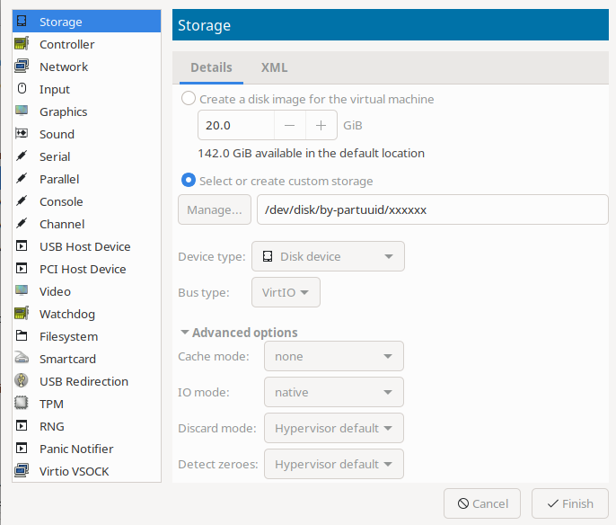 這部份就看要怎麼弄,如果打算用預設的方式(也就是建立一個 qcow2 image 檔案)就不太需要改什麼,我這邊打算直接把實體硬碟的一個 partition 分配給虛擬機使用