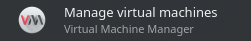 這個動作我們透過 virt-manager GUI 來做,應該可以在 desktop environment 的應用程式清單找到 Virtual Machine Manager,要不然在 terminal 輸入 virt-manager 啟動: