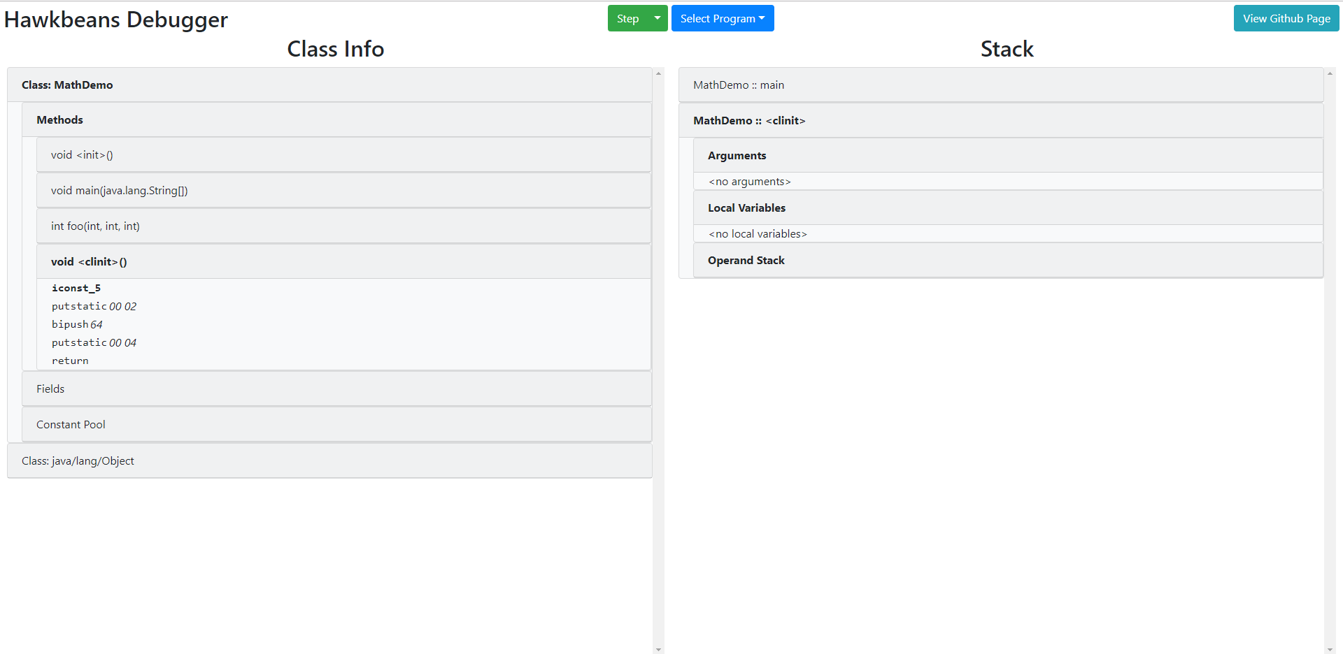 When the website loads, begin by selecting a program from the "Select Program" dropdown at the top. After the inital setup has finished, the Class Info and Stack sections should be loaded. The Class Info section contains data related to all the loaded classes. It shows the methods of each class with the decoded bytecode, the static fields and their values, and the data in the constant pools. Note that the current class, method, and instruction being executed are bolded so that the used can keep track of what code is being run. On the right is the Stack section, which contains all the current stack frames. Each frame has a list of arguments and local variables, along with the operand stack.