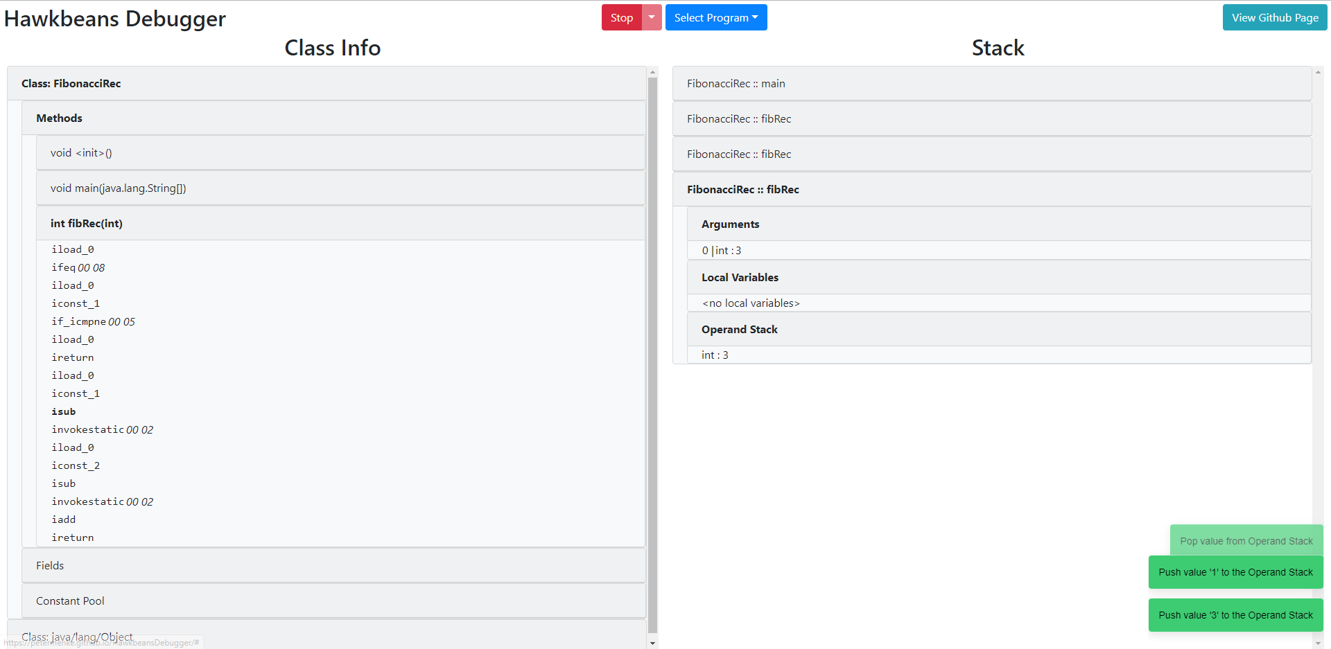 HawkbeansDebugger is a debugger and visualizer tool built on top of the Hawkbeans JVM that allows users to run a set of predetermined programs. Its purposes are: