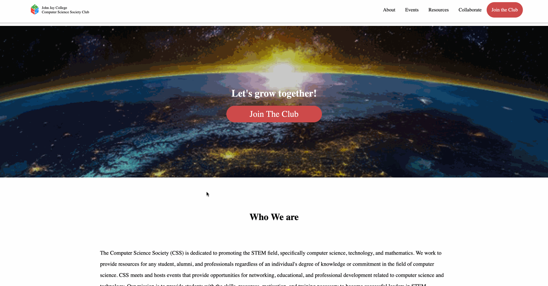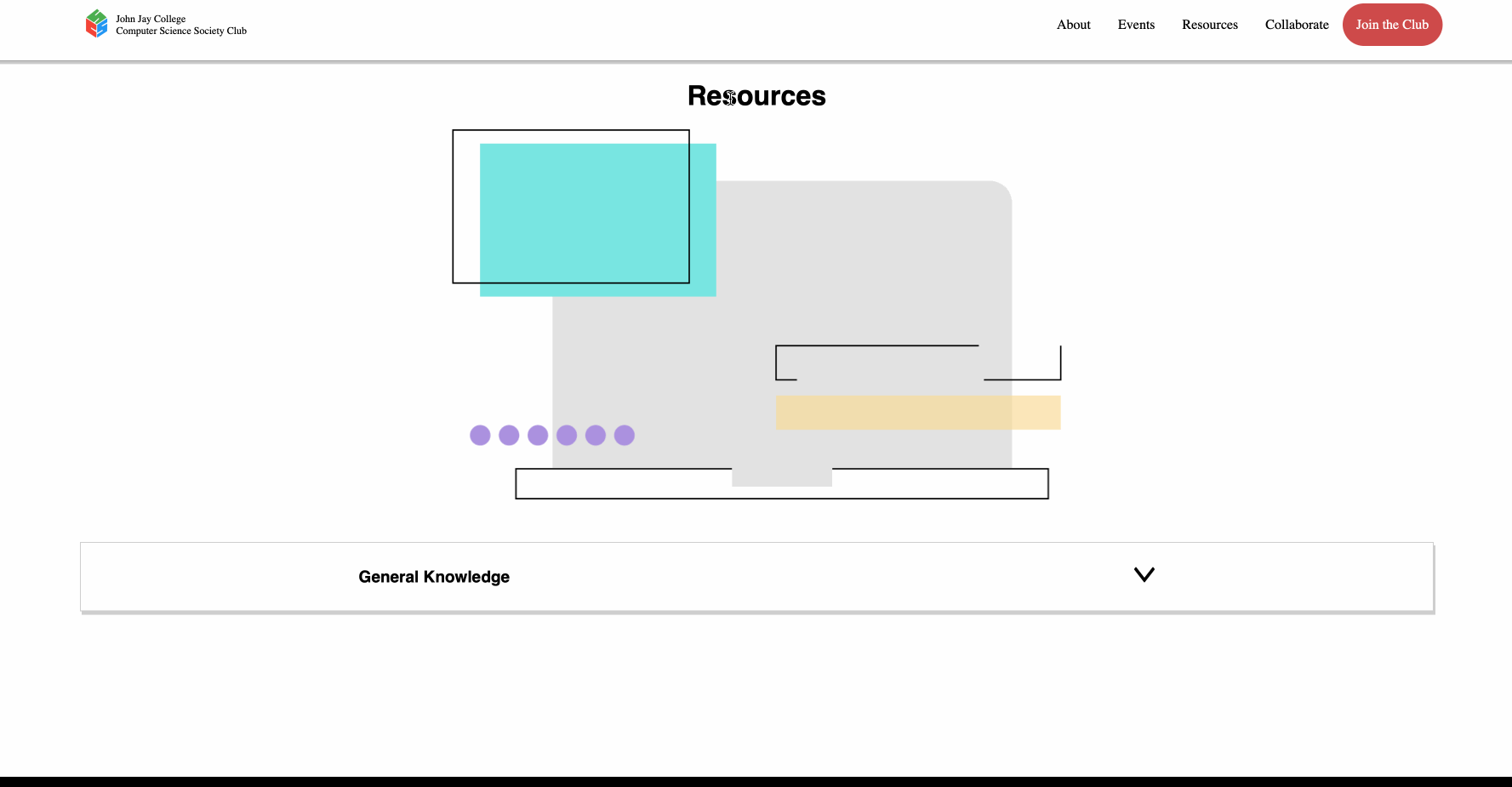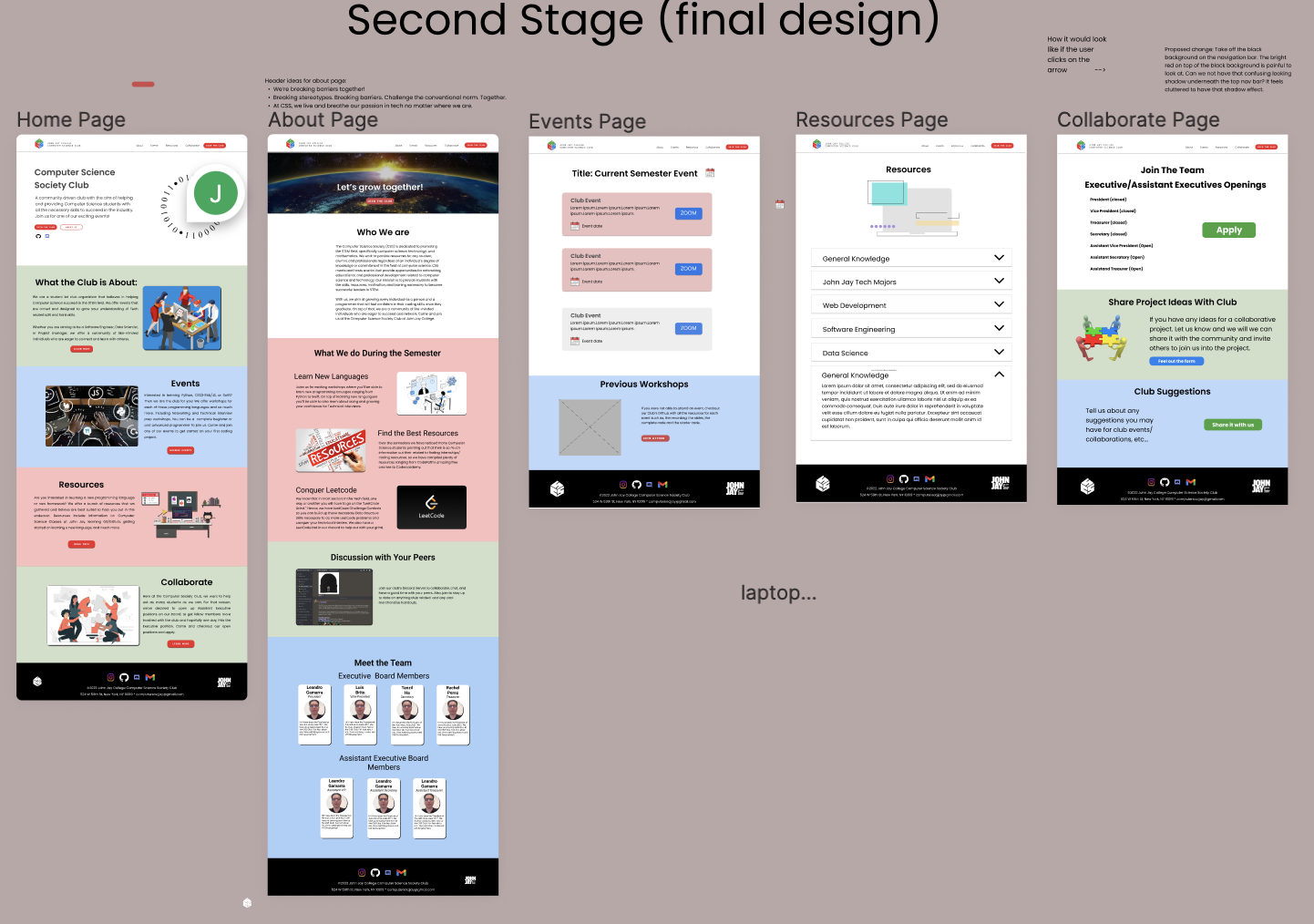 - We decided to split the page into 5 pages: Home page, About page, Events page, Resources page, and Collaborate page. The Home page, includes a summary of all the pages, but with brief descriptions. The About page, goes into more detail about who the club is and what you'd expect from being a part of the club. The Events page consisted of a list of the club's events/workshops for the semester. Next, the Resources page includes resources that we decided would be best suited for club members. Lastly, the Collaborate page consists of ways the club has for students to become Executives and Assistant Executives of the club.
