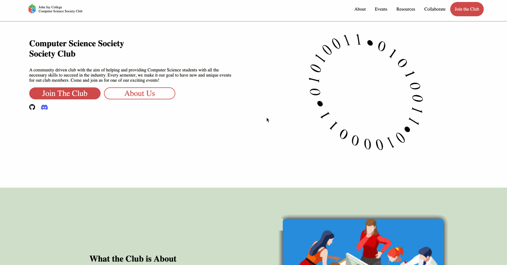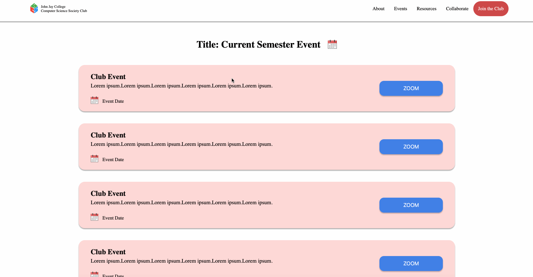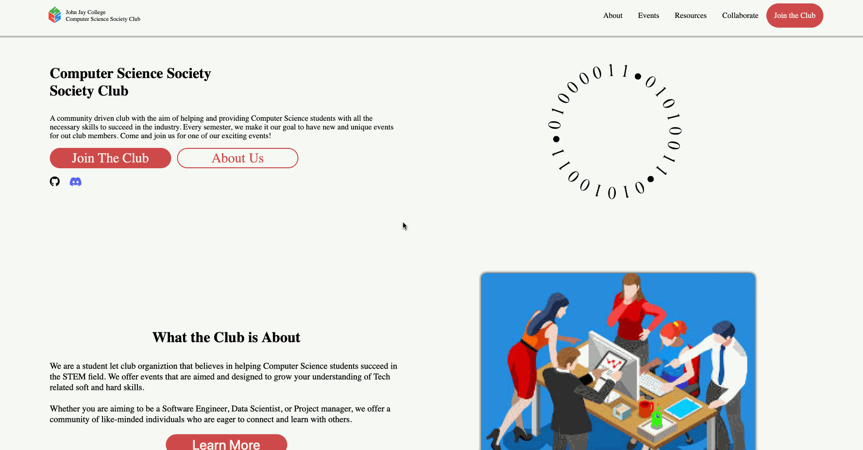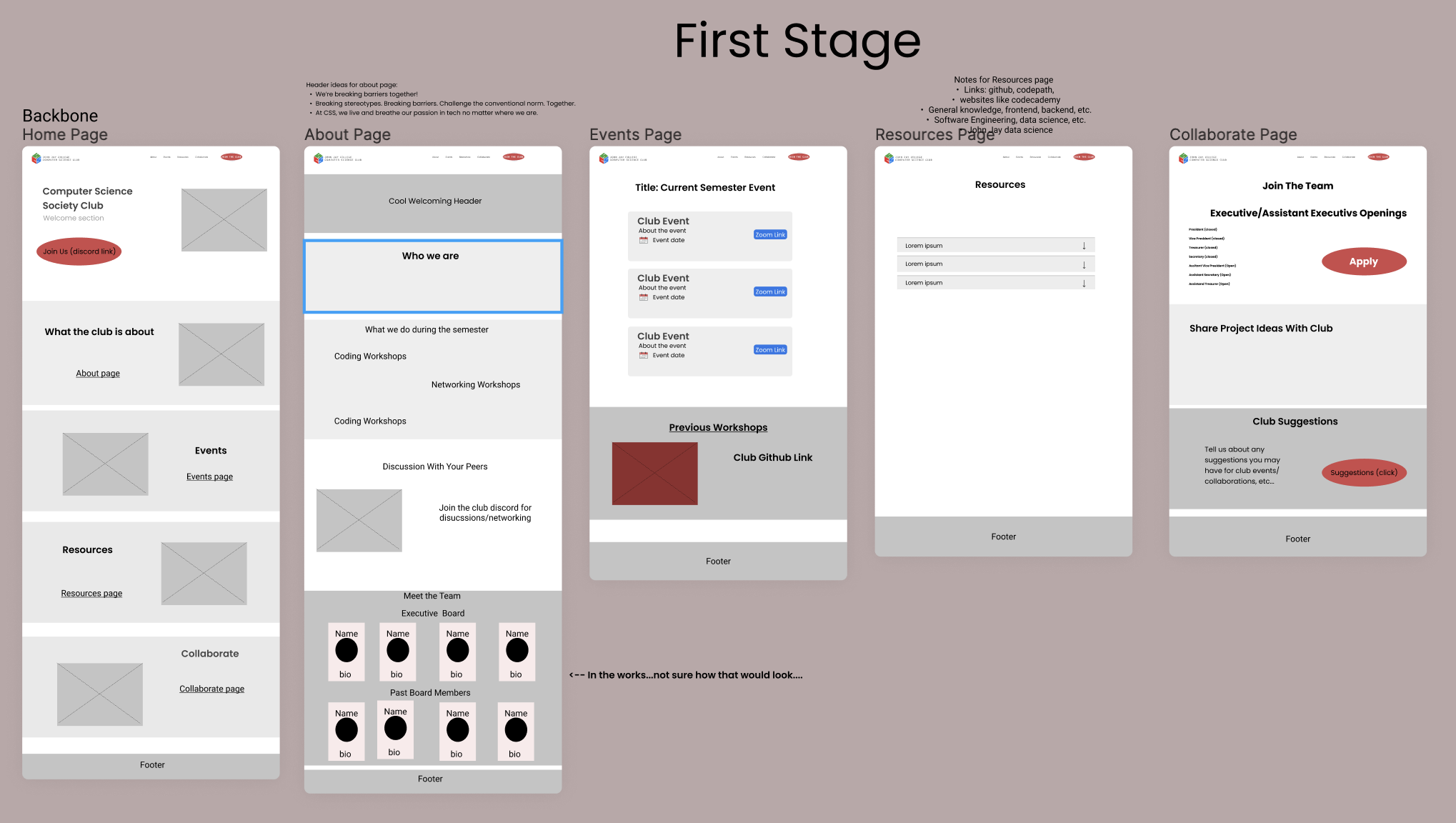 - We decided to split the page into 5 pages: Home page, About page, Events page, Resources page, and Collaborate page. The Home page, includes a summary of all the pages, but with brief descriptions. The About page, goes into more detail about who the club is and what you'd expect from being a part of the club. The Events page consisted of a list of the club's events/workshops for the semester. Next, the Resources page includes resources that we decided would be best suited for club members. Lastly, the Collaborate page consists of ways the club has for students to become Executives and Assistant Executives of the club.