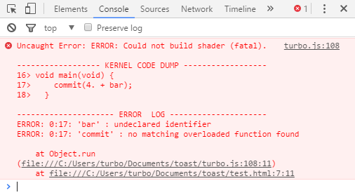 GLSL code is compiled by your GPU vendor's compiler. Usually these compilers provide verbose error information. You can catch compile-time errors by catching exceptions thrown by turbo.js. As an example, consider this invalid code: