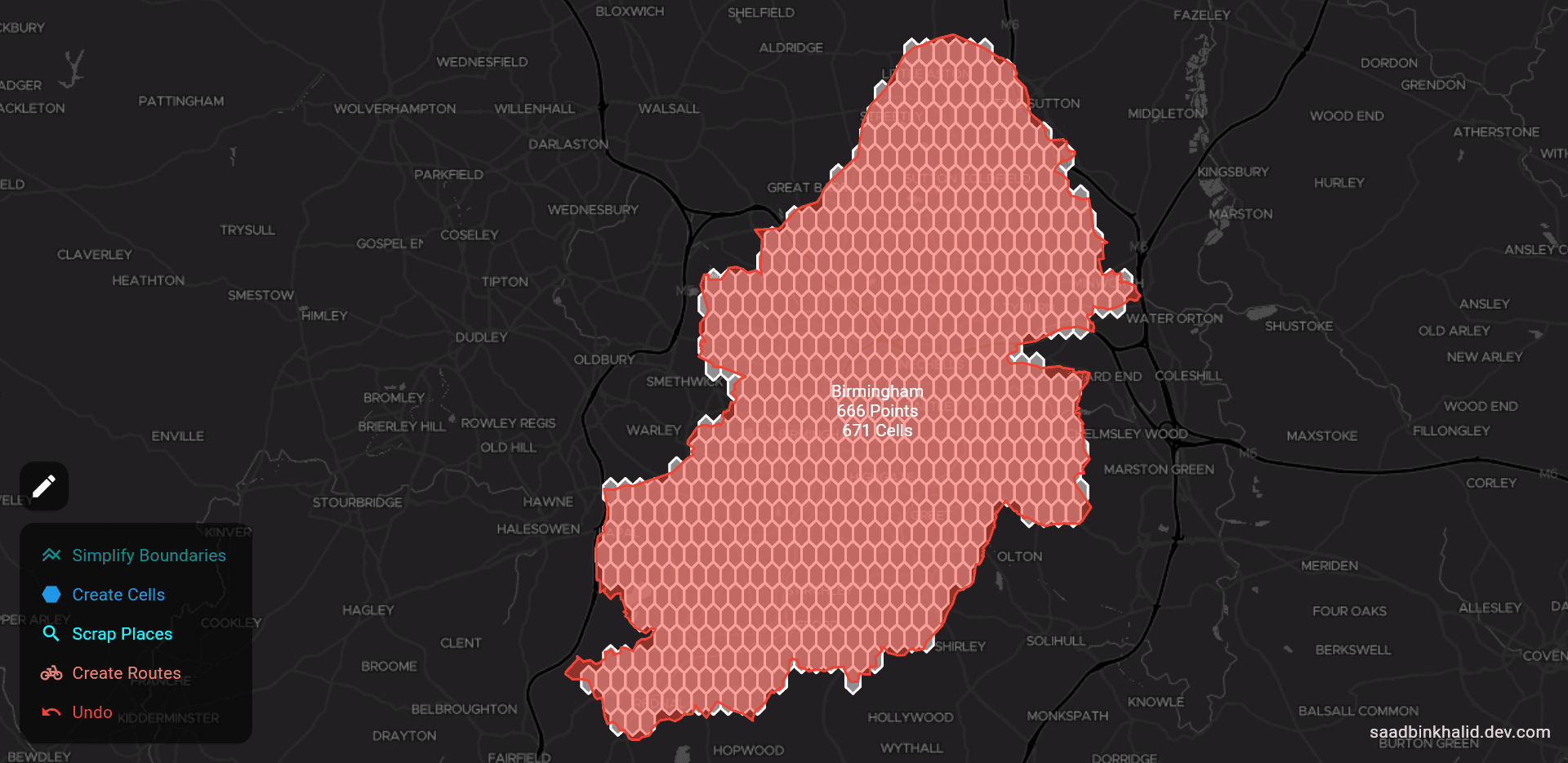 The idea is to fill the region with a grid of small cells and query the Places API in each of them. I experimented with circular cells but they were simply inaccurate with gaps, overlaps, and inconsistency at different latitudes, especially around the poles.