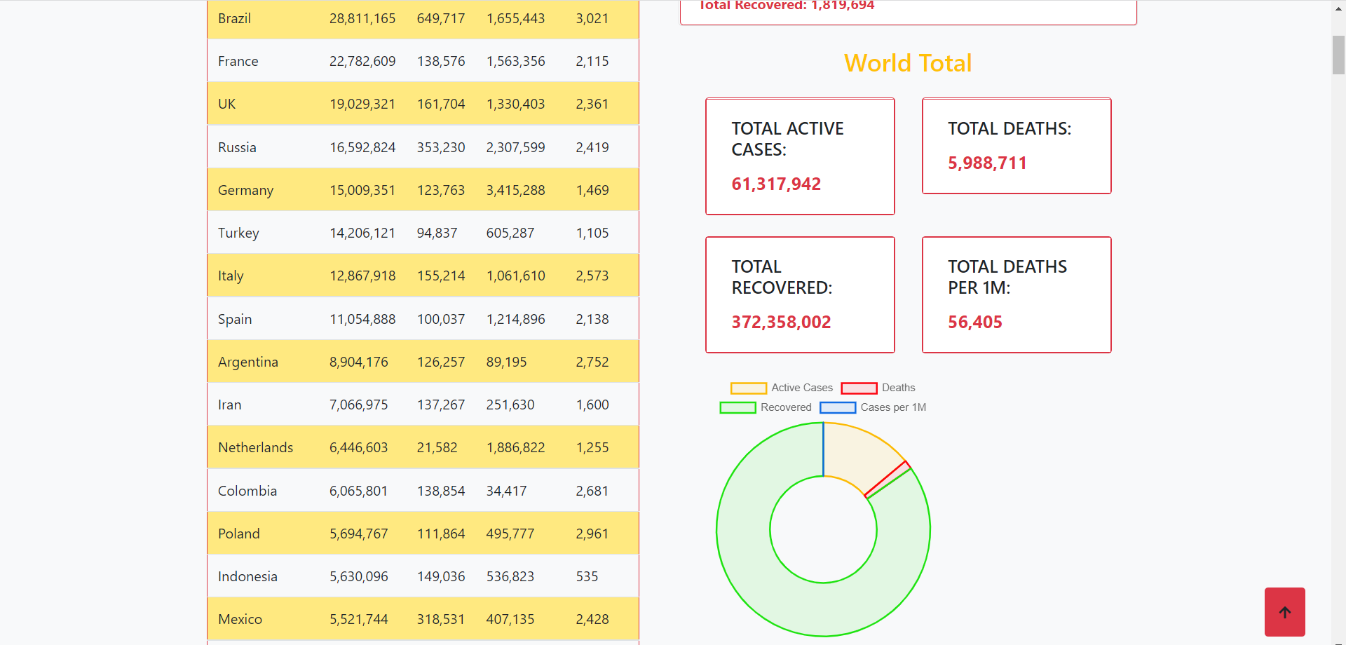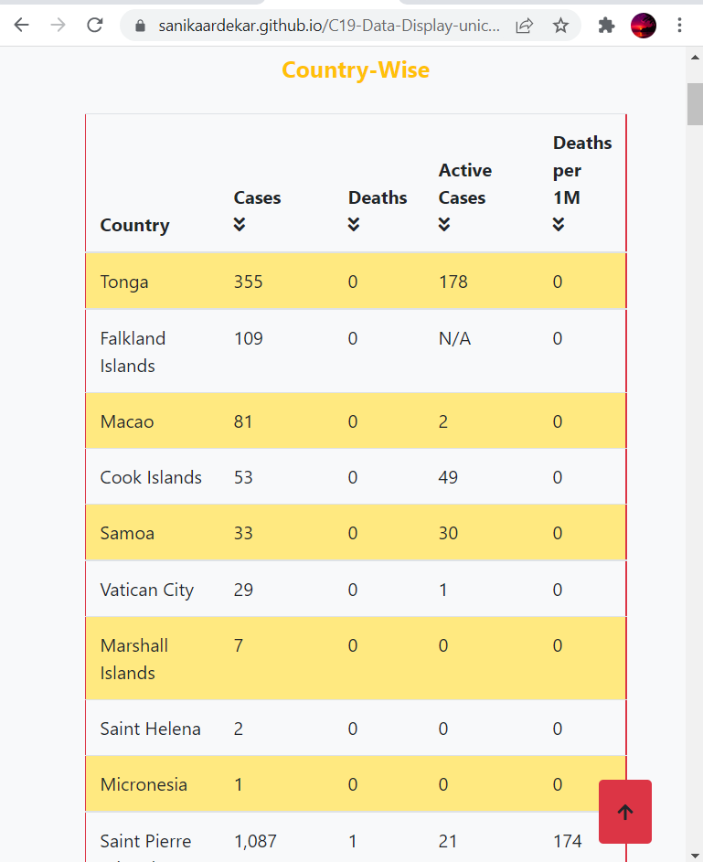 Implemented a table displaying cases, deaths, active cases and deaths per 1M population country-wise using External Api