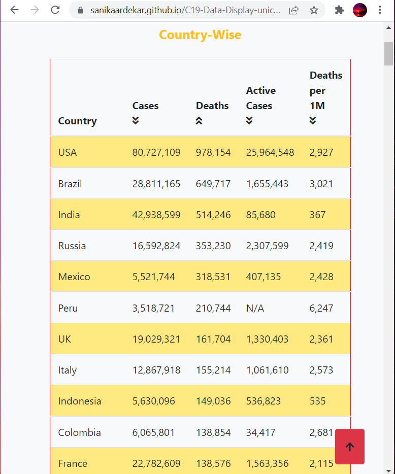 Now the number of deaths in countries is displayed in ascending order by clicking on the upward arrow