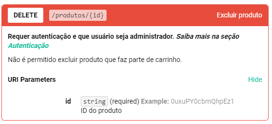 Exemplo de uso de parâmetro Path com a requisição Delete Produtos:
