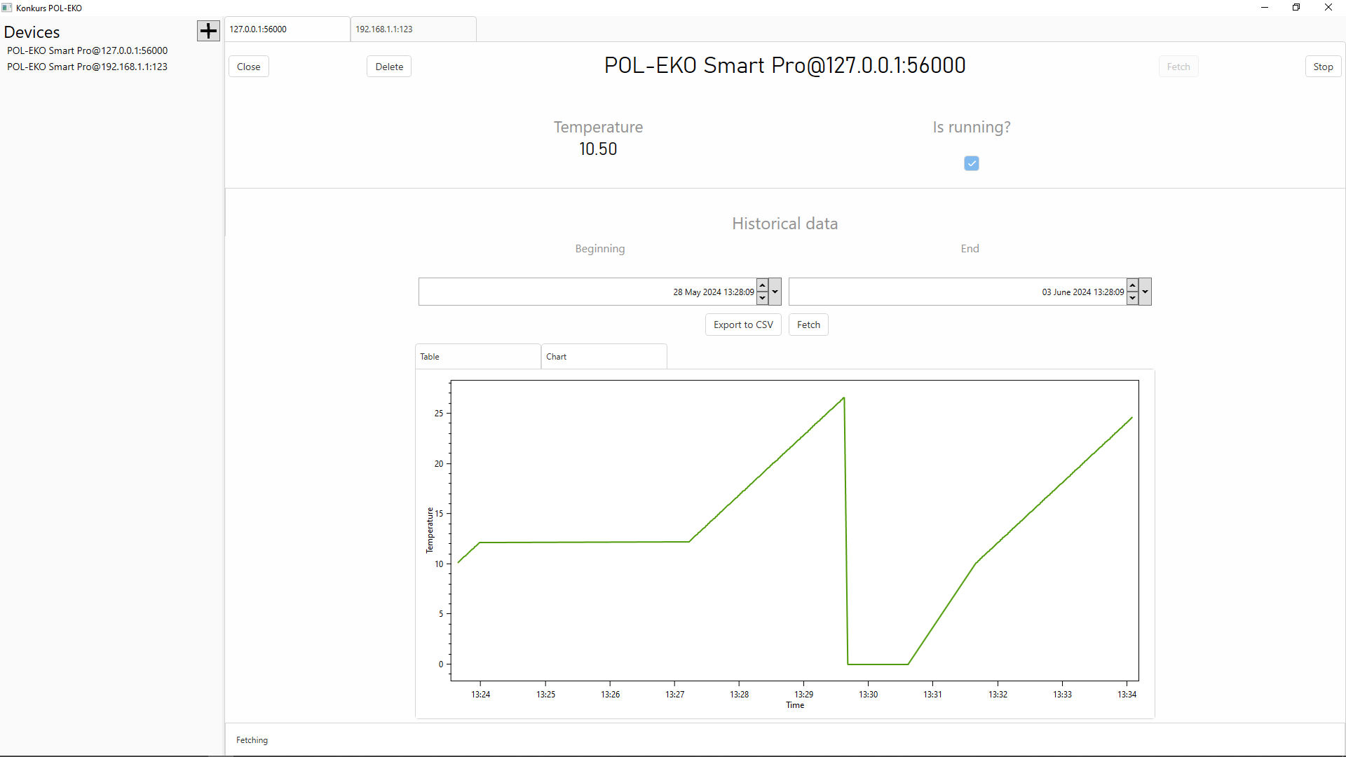 It gets data from a proprietary device over HTTP and then displays them to end user as well as saves them to the database. User can view the data fetched from the device in real time or display the data saved in the database in form of a chart or a table by simply specifying the timespan.