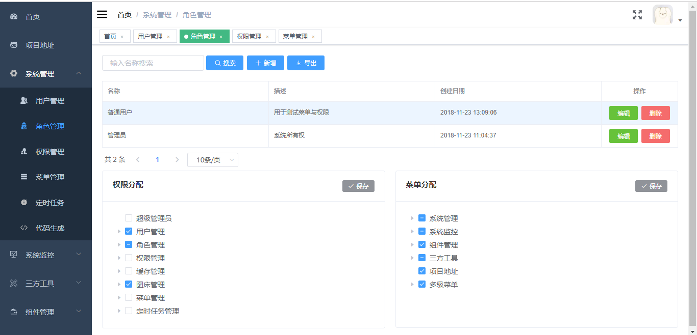 - 菜单管理 已实现菜单动态路由,后端可配置化,支持多级菜单