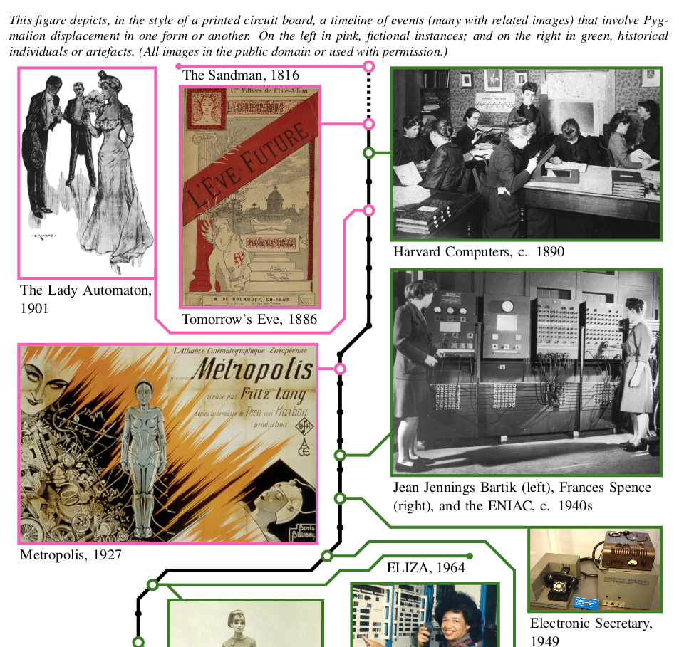 We therefore argue that Turing’s thought experiment can be seen as a case of Pygmalion displacement (i.e. the humanization of AI through the dehumanization of women). As such, it serves as a noteworthy bridge between fictional and actual attempts to replace women with machines. After this ‘interlude’, we develop our Pygmalion lens (Table 1), which is described in detail in the section titled The Pygmalion lens: real myths or mythical realities?.