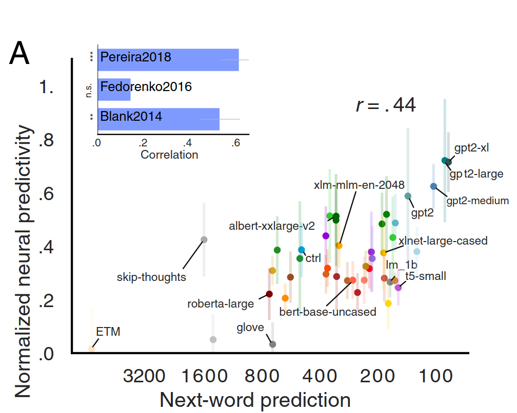 - The neural architecture of language: Integrative modeling converges on predictive processing, Schrimpf, M., Blank, I., Tuckute, G., Kauf, C., Hosseini, E., Kanwisher, N., Tenenbaum, J., Fedorenko, E