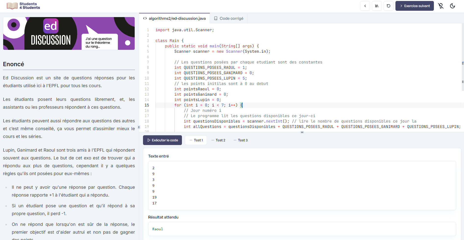 Il y a toujours un titre, une description, un code (default, le code affiché dans l'éditeur quand le participant ouvre la page, et corrected, le code corrigé) et une paire de clés-valeurs tests qui contient les inputs et outputs attendus pour chaque test.