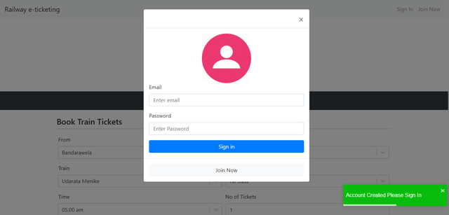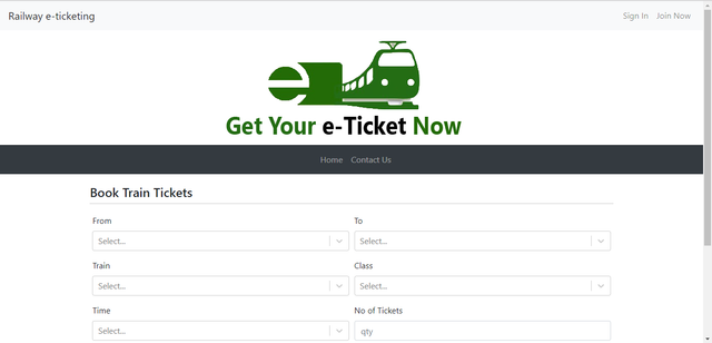 In this web application users can provide the start and the destination locations, train, class, time, ticket quantity and the date of booking. Users can pay using credit/debit cards or by mobile phone, in which the amount is added to the mobile bill. If the user chooses card payment, the confirmed booking details will send to the email of the user by using “nodemailer” email service. If user chooses mobile payment the booking details will send to the entered mobile number using “Twilio” mobile service.