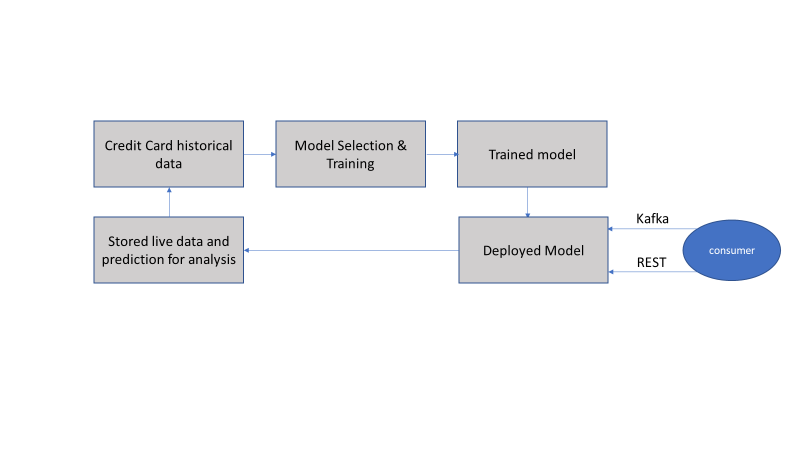The pipeline utilises a cassandra database for stored credit-card-fraud analysis a source for testing and training data for model. The trained models(for Kafka and REST) were deployed to make predictions from live transaction data.