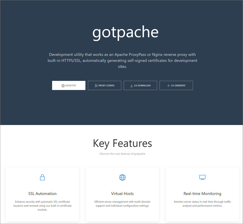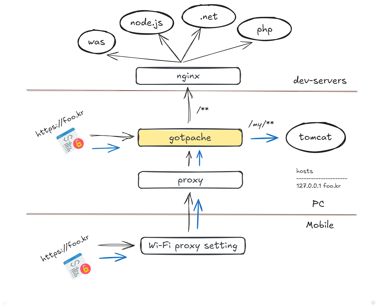 Gotpache는 개발/테스트환경에서 apache의 ProxyPass 기능과 SSL인증서를 간편하게 사용하기 위해서 개발한 프로그램입니다.