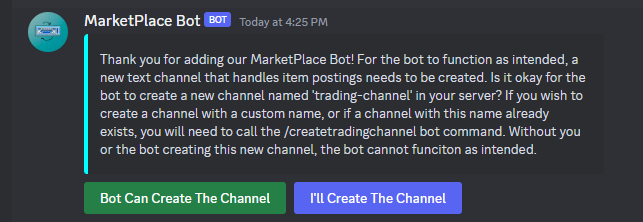If the owner selects "Bot Can Create The Channel", the bot will attempt to create a new text channel named "trading-channel". If a channel with that name already exists OR if "I'll Create The Channel" is selected, the server owner MUST call the command /createtradingchannel to create the trading channel. The owner MUST input a custom, unique name for the channel when calling the command. If they do not and they enter a name that already is present in the server, they will have to call the command again until a unique name is given.