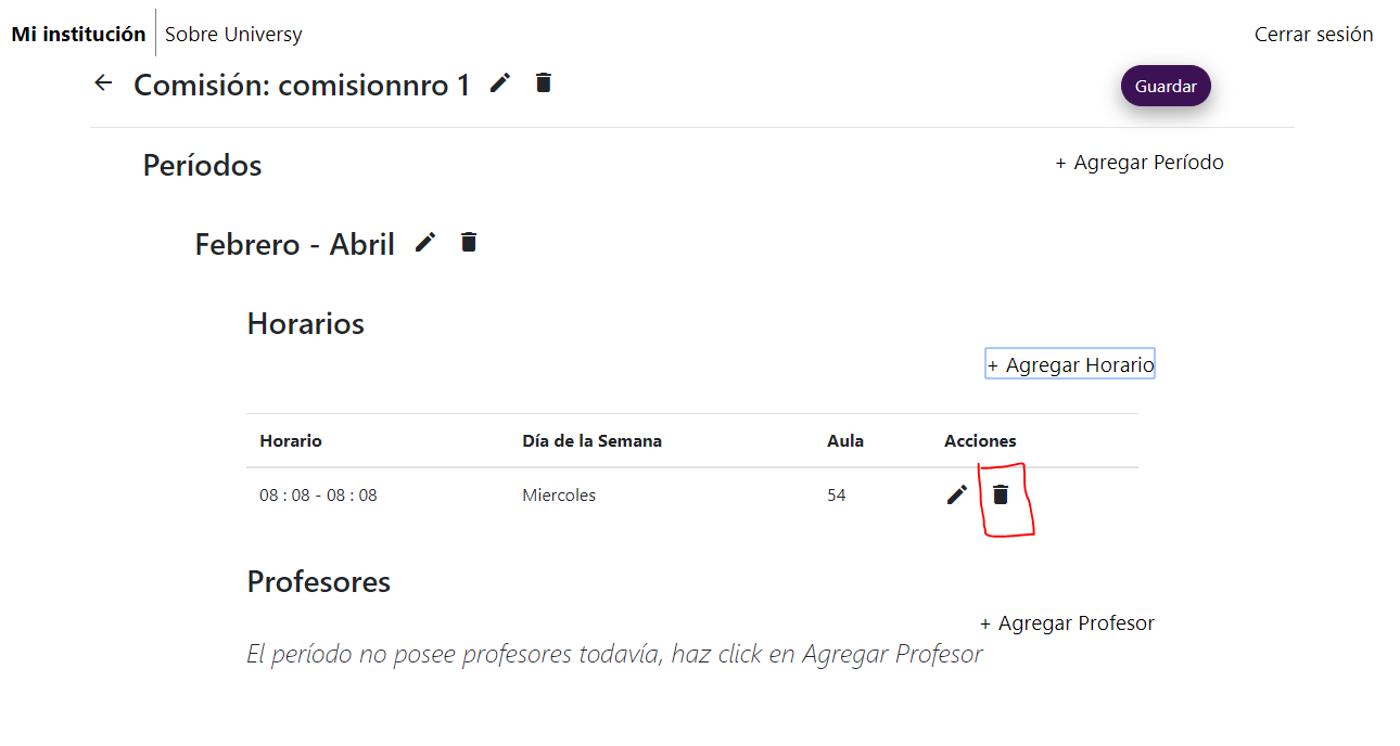 Estaria bueno que cuando se quiere eliminar un horario o un profe pida confirmacion xqe (al menos el horario) tiene varios campos para cargar y si se hace click en eliminar x error hay que cargar todo de nuevo.