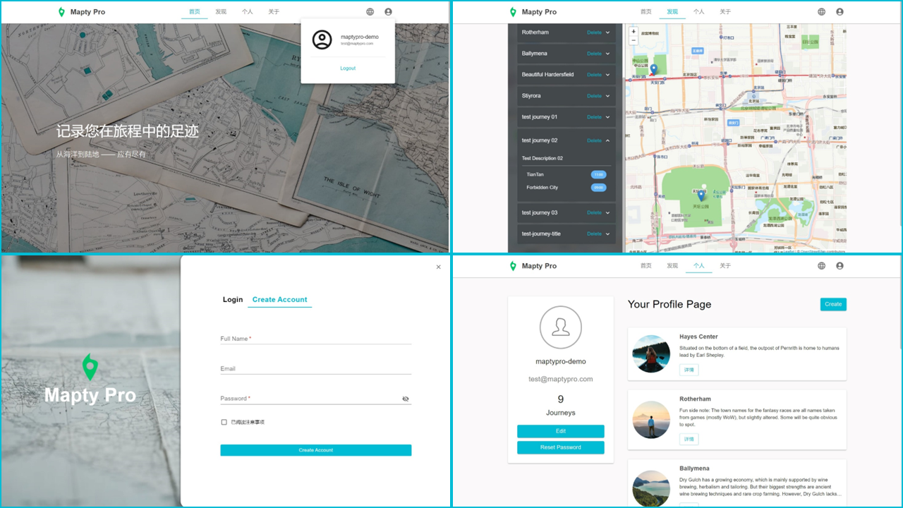Mapty Pro 是一个地图应用,允许用户创建并登录账户,同时支持修改个人信息、重置密码等。