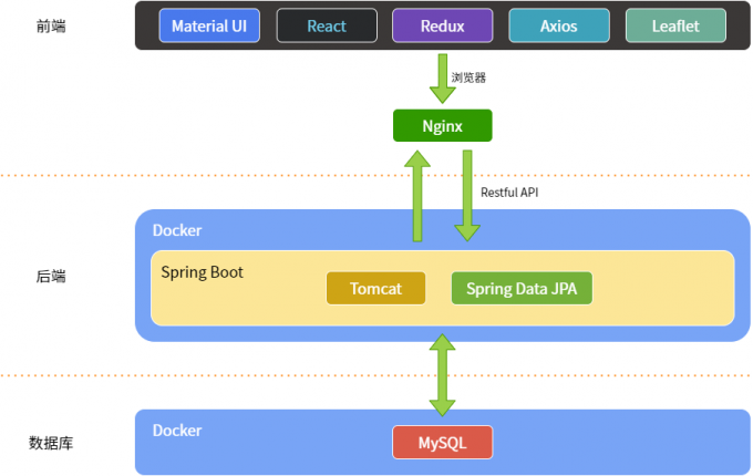 - Leaflet: 地图库,实现前端的地图渲染。旧版的 Leaflet 需要手动操作 DOM 树,此处使用 React Leaflet —— 一个基于 React 的 Leaflet 封装