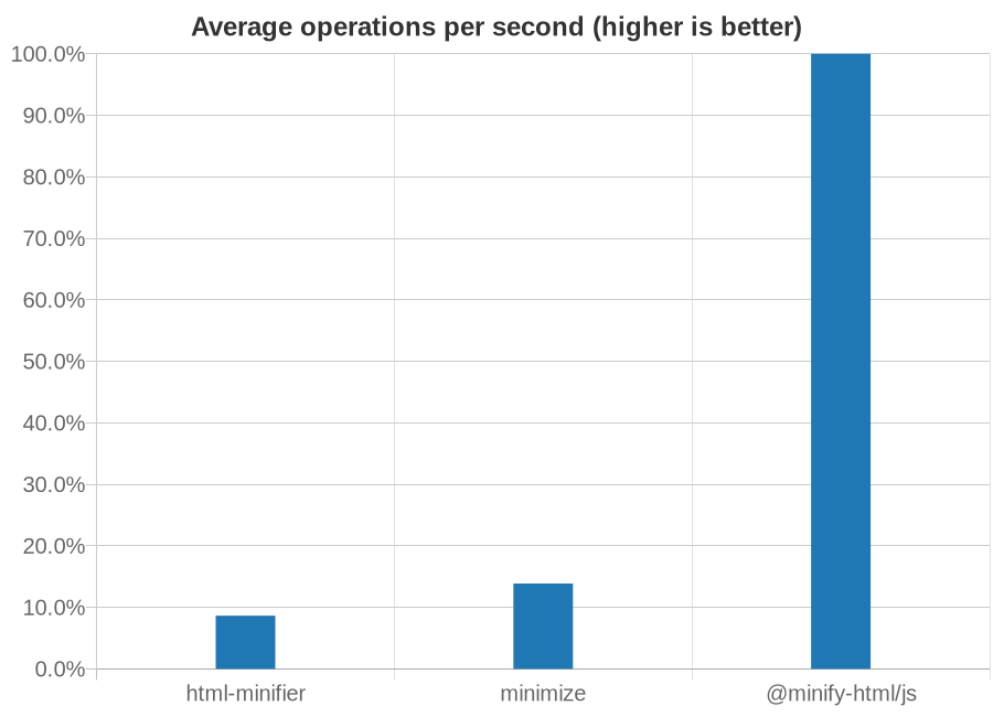 Comparison with html-minfier and minimize, run on the top web pages. See the breakdown here.