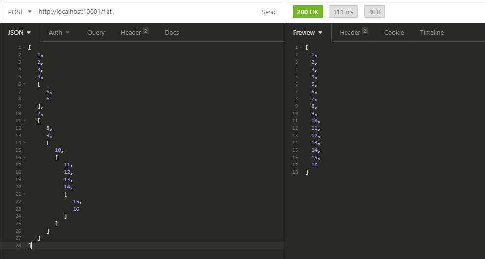 docker run --name flatter -i -d --rm -p 10001:10001 flatter:1.0.0An HTTP Server listens on: